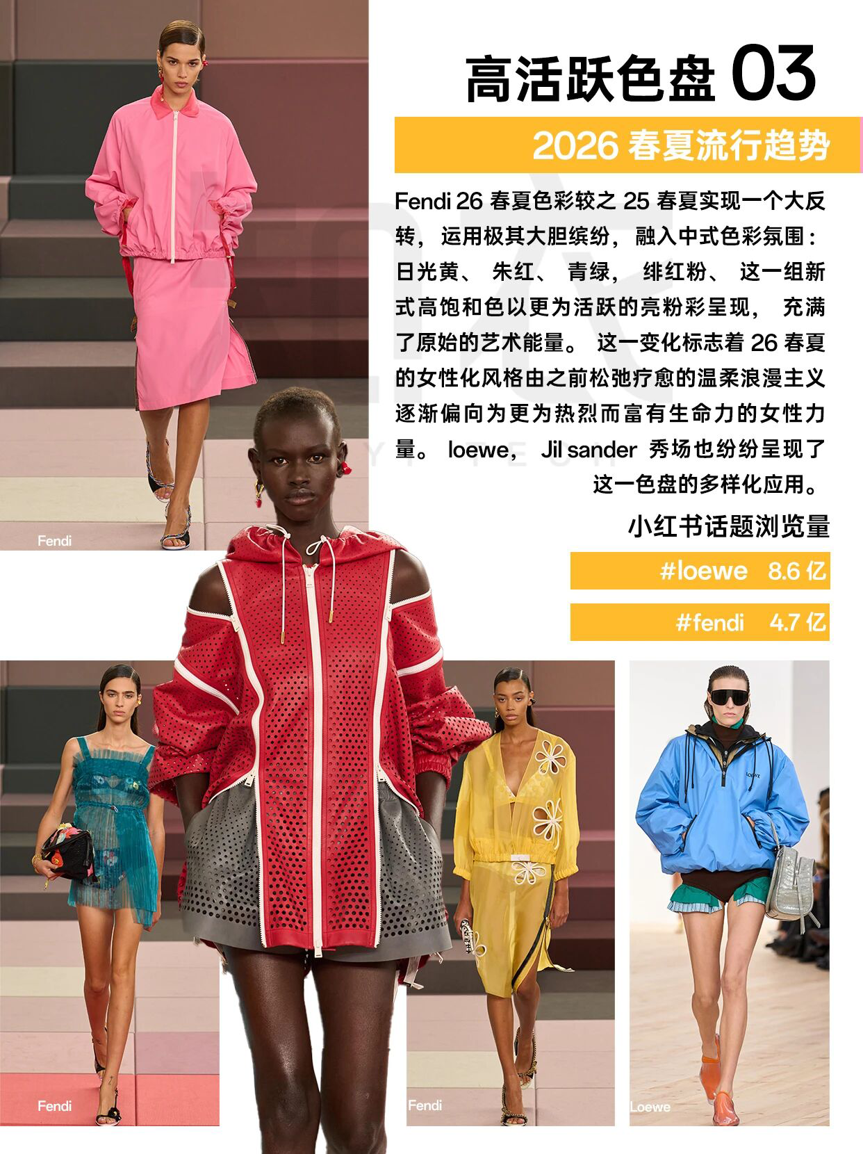 Fendi26春夏色彩较25春夏实现一个大反转,运用极其大胆的缤纷色彩,融入中式色彩氛围,充满了原始的艺术能量。 这一变化标志着26春夏的女性化风格将偏向为更为热烈而富有生命力的女性力量。 代表秀场:Loewe,Jil Sander。