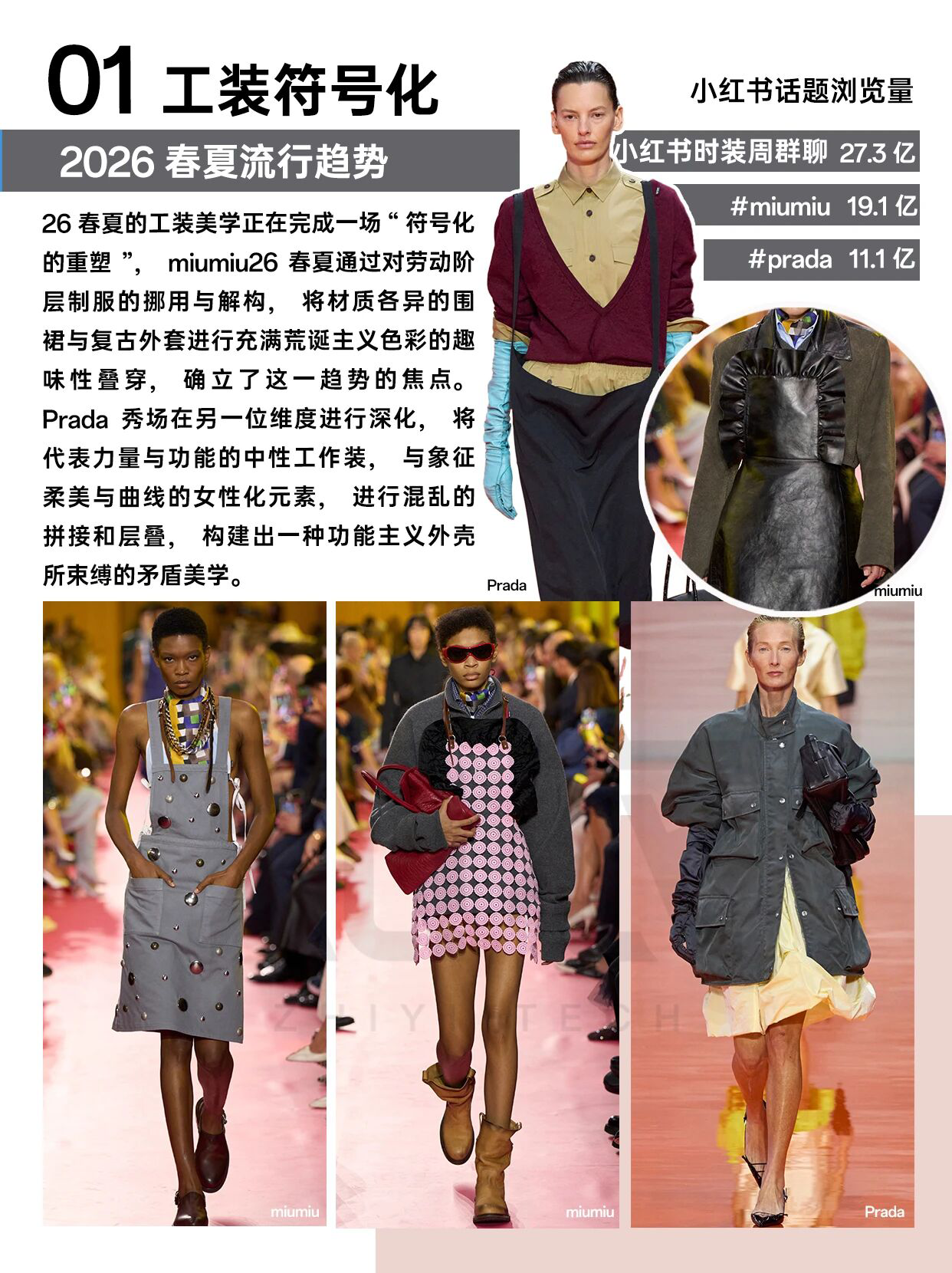 26春夏的工装美学正在完成一场“符号化的重塑”,以Miumiu26春夏为引爆点,通过对劳动阶层制服的挪用与解构,将材质各异的围裙与复古外套进行趣味性叠穿,确立了这一趋势的焦点。